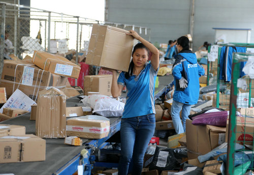 资料图片:一家快递公司工作人员在广西南宁市玉洞物流中心忙着搬运包裹。